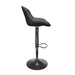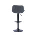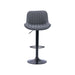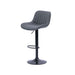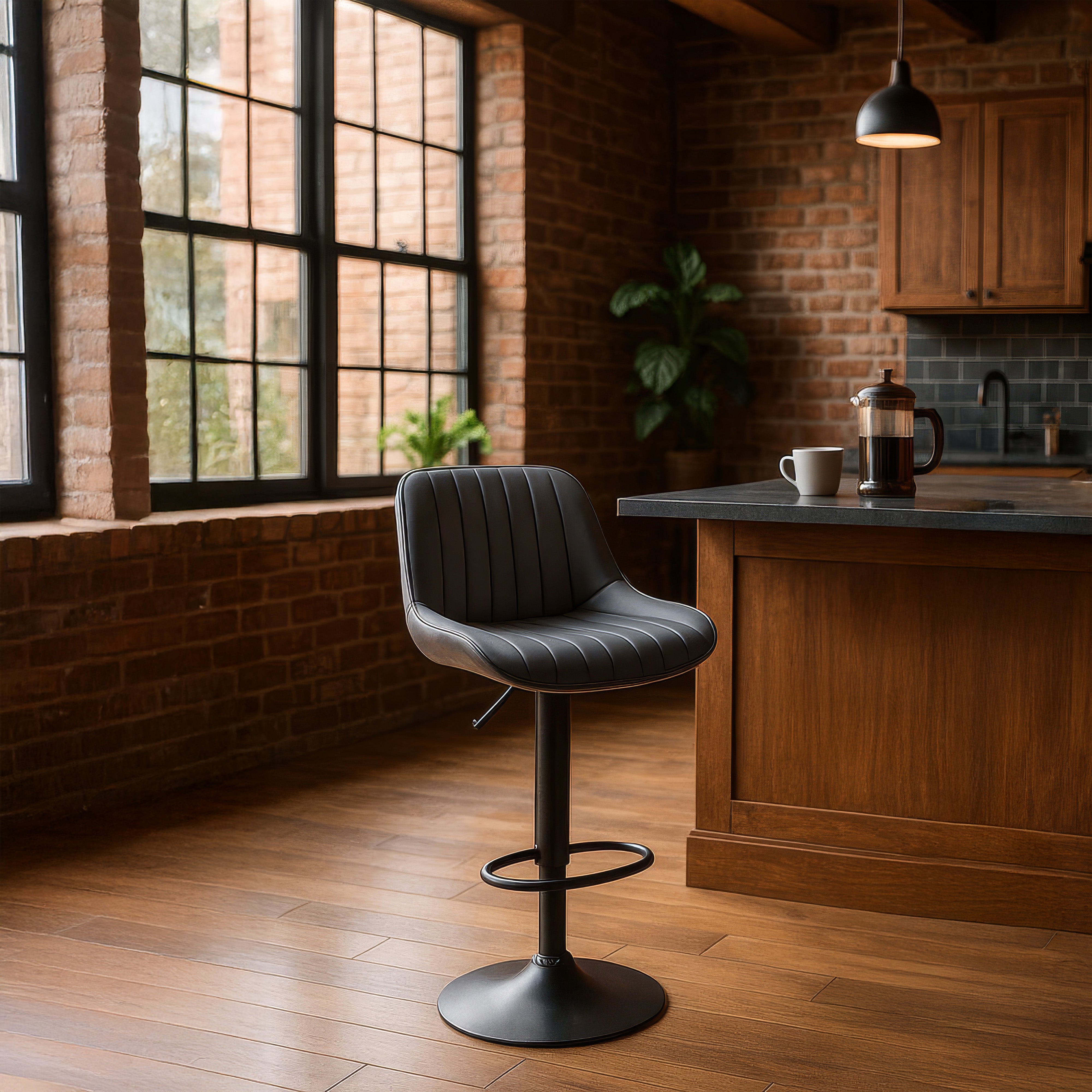 Each stool features a padded, contoured seat upholstered in premium grey faux leather with elegant vertical stitching. The smooth gas-lift mechanism and 360° swivel allow seamless adjustment and movement, while the matte black metal base ensures lasting stability and sleek aesthetics.