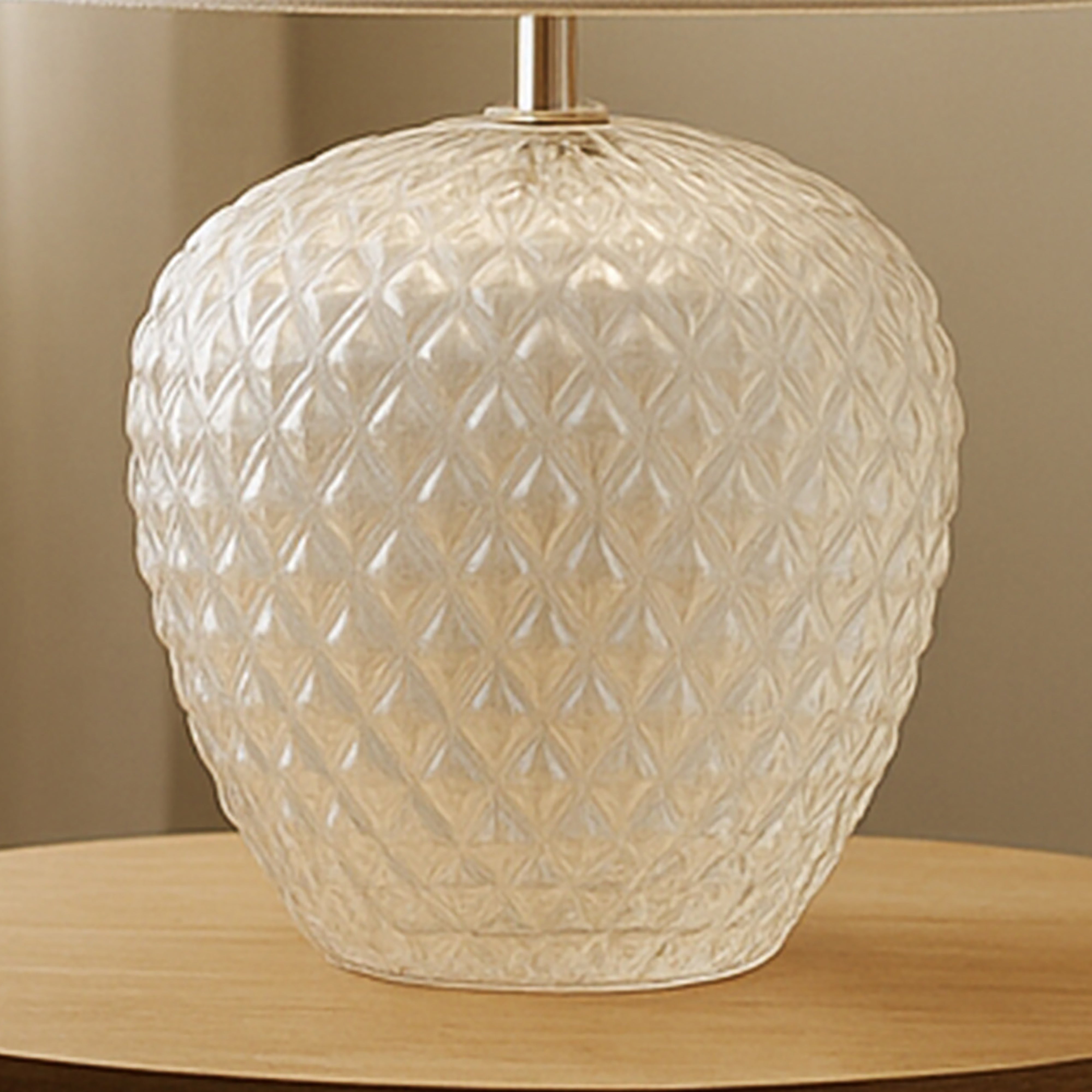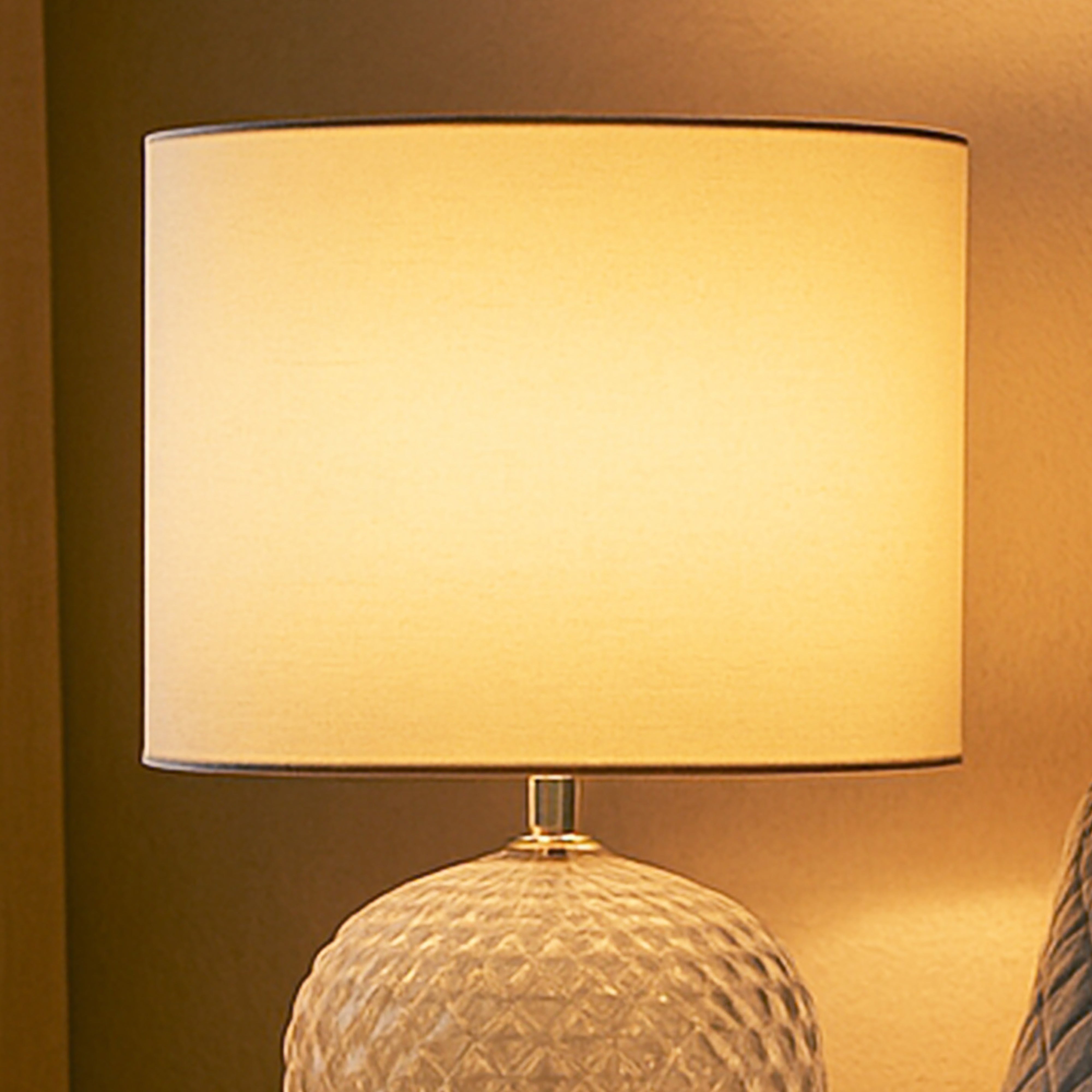 The Annie desktop lamp by Urban Style brings together graceful form and timeless texture. Its softly rounded glass base, styled in a raised diamond pattern, evokes hand-crafted artistry, while the neutral grey palette and fabric shade offer a calming and elegant light.
